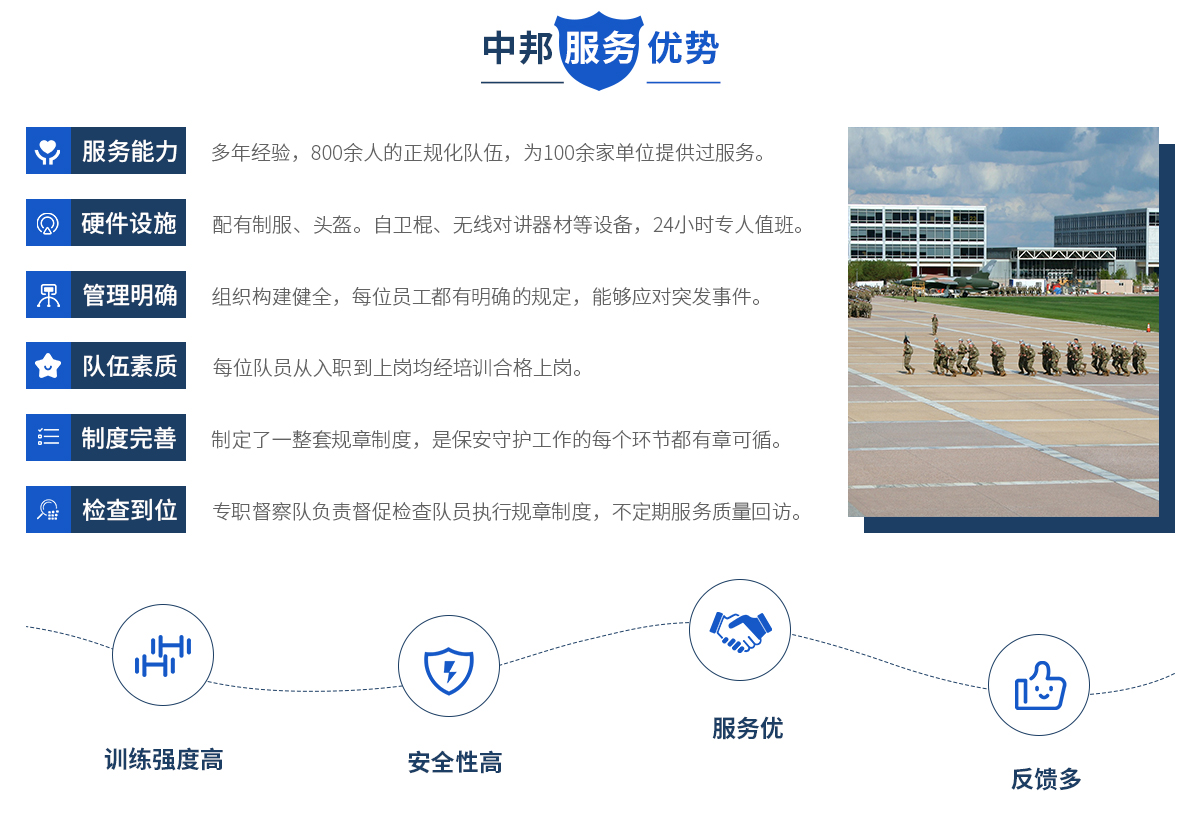 中邦服務簡介 安徽中邦保安服務有限公司總公司成立于2019年。公司 成立以來,始終以“文明值勤、優良服務、客戶至上、安全為先” 為宗旨,以保一方平安為已任,面向社會各界等提供有償保安護 衛、技術防范、保安培訓,是一家專業化保安服務公司。目前, 公司下為200多家客戶單位提供周到安全的保安服務,遍布全省 及周邊地區,現有各類專業人員和保安員2000余名。 中邦服務宗旨 安徽中邦保安服務有限公司是為適...